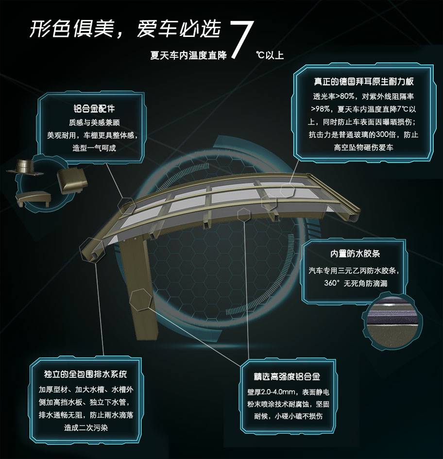 贵阳崔霖影像技术有限公司车棚系列全部采用高品质、高强度铝合金材料精加工而成,具备的氧化保护能力,不生锈,表面特殊的工艺处理,大大提高了车棚的使用寿命。顶棚使用添加了防止紫外线涂层的德国拜耳耐力板,降低了来自紫外线的分解,历久弥新,成就了优越的耐候性。