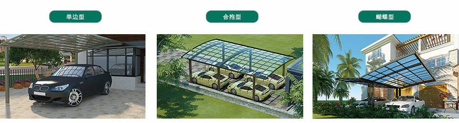 款式:单边型车棚、合抱型车棚、蝴蝶型车棚